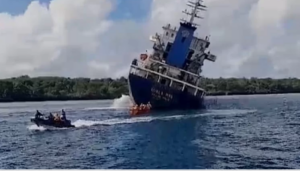 Kapal Kargo MV Kuala Mas karam di Teluk Kupang, NTT, Sabtu 21/12/2024 pagi. (victorynews.id/mikael umbu)