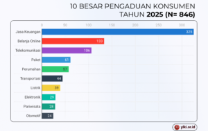 Berdasarkan catatan YLKI, sepuluh besar pengaduan konsumen sepanjang 2025 masih didominasi oleh sektor-sektor yang bersentuhan langsung dengan kebutuhan dasar dan layanan esensial masyarakat. Jasa keuangan sebanyak 325 pengaduan, belanja online 133 pengaduan, telekomunikasi 106 pengaduan, paket 61 pengaduan, dan perumahan 57 pengaduan, sehingga menjadi sektor yang paling sering menimbulkan sengketa antara konsumen dan pelaku usaha.