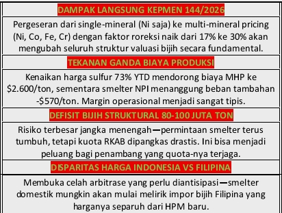 Sementara itu, pasokan bijih nikel dari Filipina saat ini belum menyesuaikan harganya secara instan terhadap guncangan HPM Indonesia, menjadikan mereka sasaran arbitrase jangka pendek bagi pembeli Tiongkok.